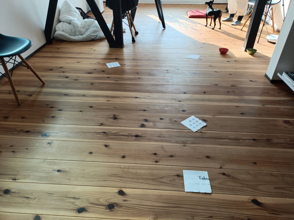 2月27日はそれぞれがドキュメントにまとめた資料の発表、過去の事例をすこし真似した指示書づくりとパフォーマンスを実際に行いました。紙にそれぞれ指示を書いて散りばめ、交互に拾ってそれをパフォーマンスするという簡単なものです。パフォーマーの伴戸さんは「その人がどんが動きを見せるか」を想像しながら指示書を作り、アーティストのユミソンは「その場にどのような影響を与えるか」という、人の動きを見るのか場所の特性をみるのかというそれぞれの専門領域からの視点の違いなども明らかになって興味深かったです。